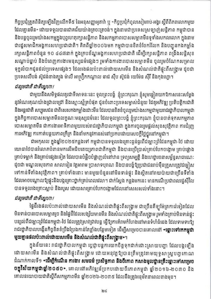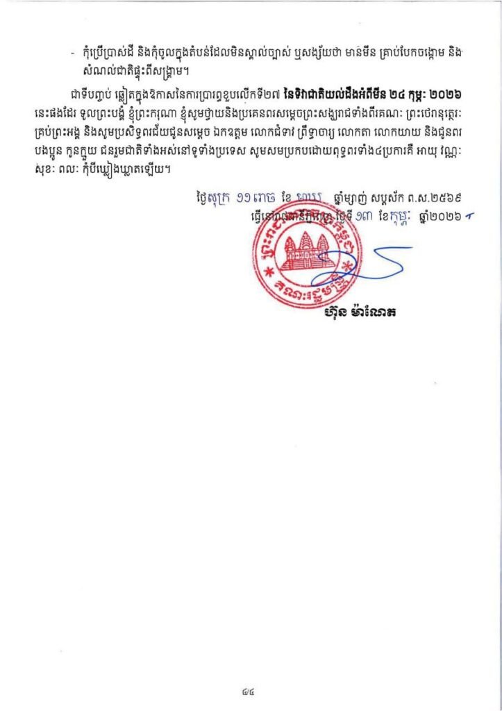 (ភ្នំពេញ)៖ សម្តេចមហាបវរធិបតី ហ៊ុន ម៉ាណែត នាយករដ្ឋមន្ត្រីនៃកម្ពុជា បានចេញសារលិខិតក្នុងឱកាសប្រារព្ធខួបលើកទី២៧ នៃទិវាជាតិយល់ដឹងអំពីមីន (២៤ កុម្ភៈ ២០២៦) ក្រោមប្រធានបទ «ចូលរួមទាំងអស់គ្នា ដើម្បីជនភៀសសឹក និងសហគមន៍មានសុវត្ថិភាព»។ ខាងក្រោមនេះជាសារលិខិតរបស់សម្តេចបវរធិបតី ហ៊ុន ម៉ាណែត៖