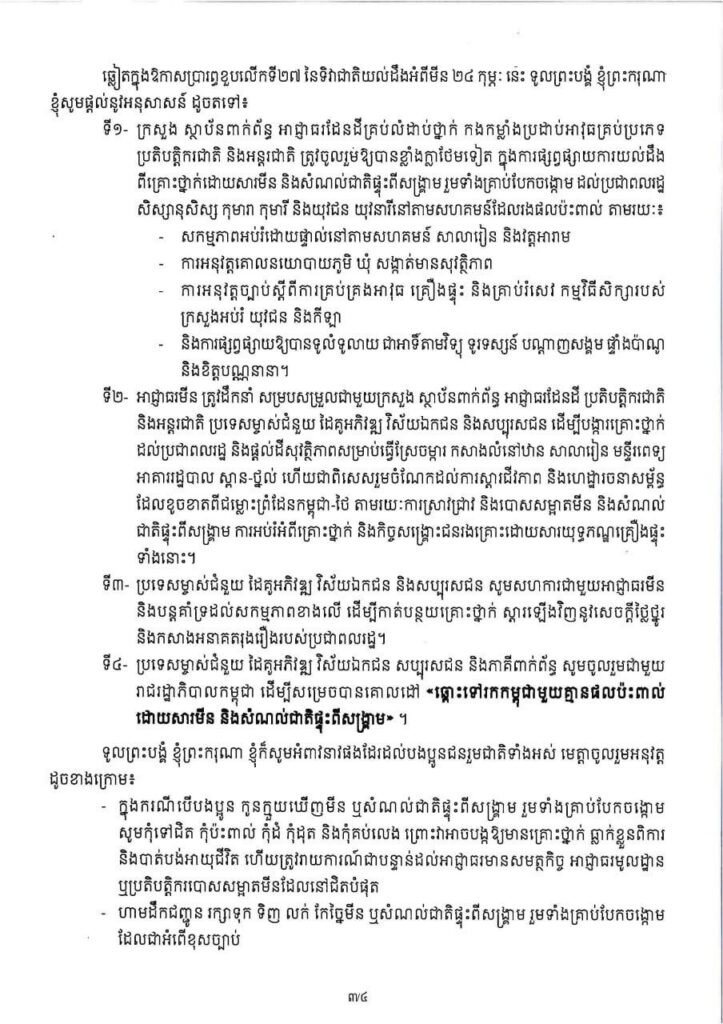 សារលិខិតរបស់សម្តេចបវរធិបតី ហ៊ុន ម៉ាណែត ក្នុងឱកាសខួបលើកទី២៧ នៃទិវាជាតិយល់ដឹងអំពីមីន ក្រោមប្រធានបទ «ចូលរួមទាំងអស់គ្នា ដើម្បីជនភៀសសឹក និងសហគមន៍មានសុវត្ថិភាព»
