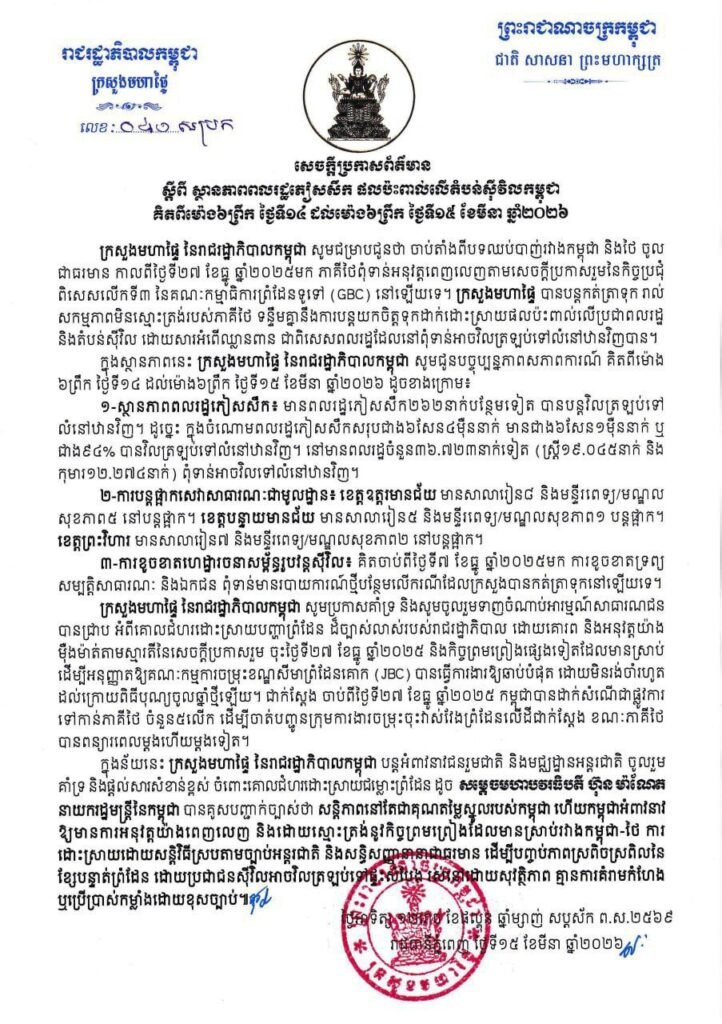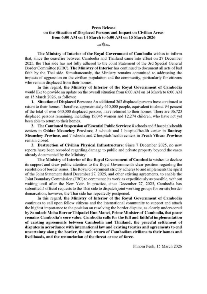 (ភ្នំពេញ)៖ ក្រសួងមហាផ្ទៃ បានបញ្ជាក់ថា គិតពីម៉ោង ៦ព្រឹក ថ្ងៃទី១៤ ដល់ម៉ោង៦ព្រឹក ថ្ងៃទី១៥ ខែមីនា ឆ្នាំ២០២៦ មានពលរដ្ឋភៀសសឹក២៦២នាក់បន្ថែមទៀត បានបន្តវិលត្រឡប់ទៅ លំនៅឋានវិញ។ ក្រសួងបន្តថា ក្នុងចំណោមពលរដ្ឋភៀសសឹកសរុបជាង៦សែន៤ម៉ឺននាក់ មានជាង៦សែន១ម៉ឺននាក់ ឬ ជាង៩៤% បានវិលត្រឡប់ទៅលំនៅឋានវិញ។ នៅមានពលរដ្ឋចំនួន៣៦ ៧២៣នាក់ទៀត (ស្ត្រី១៩ ០៤៥នាក់ និង កុមារ១២ ២៧៤នាក់) ពុំទាន់អាចវិលទៅលំនៅឋានវិញ៕